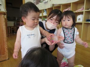 ももぐみの高月齢児のお友だちも途中から参加し、みんなで冷たい感触を楽しみました!