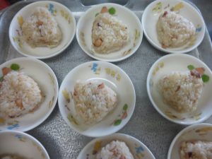給食は、オクラが和え物に!ひまわり組さんは、保育園のシソも混ぜて食べました(*^^)v